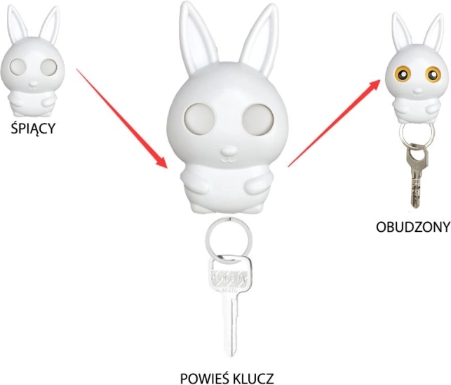 Cuier pentru chei, ideal pentru hol, unde îți vei putea agăța cheile când te întorci acasă. De îndată ce îți agăți cheile, iepurele își deschide ochii ca să poți veghea asupra lor. Instalând cuierul chiar lângă ieșire, nu vei mai uita niciodată cheile; ochii deschiși ai iepurelui îți vor aminti cu siguranță de ele.