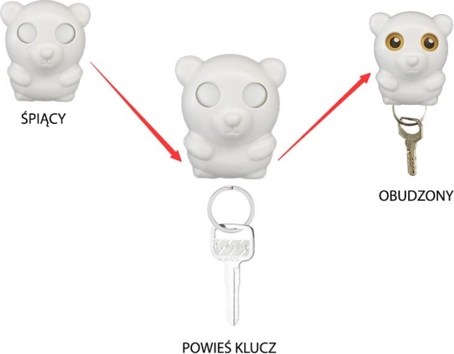 Cuier pentru chei, ideal pentru hol, unde îți vei putea agăța cheile când ajungi acasă. După ce atârni cheile, ursulețul își deschide ochii pentru a veghea asupra lor. Datorită montării cuierului chiar lângă ieșire, nu vei mai uita niciodată cheile – ochii deschiși ai ursulețului ți le vor aminti cu siguranță.