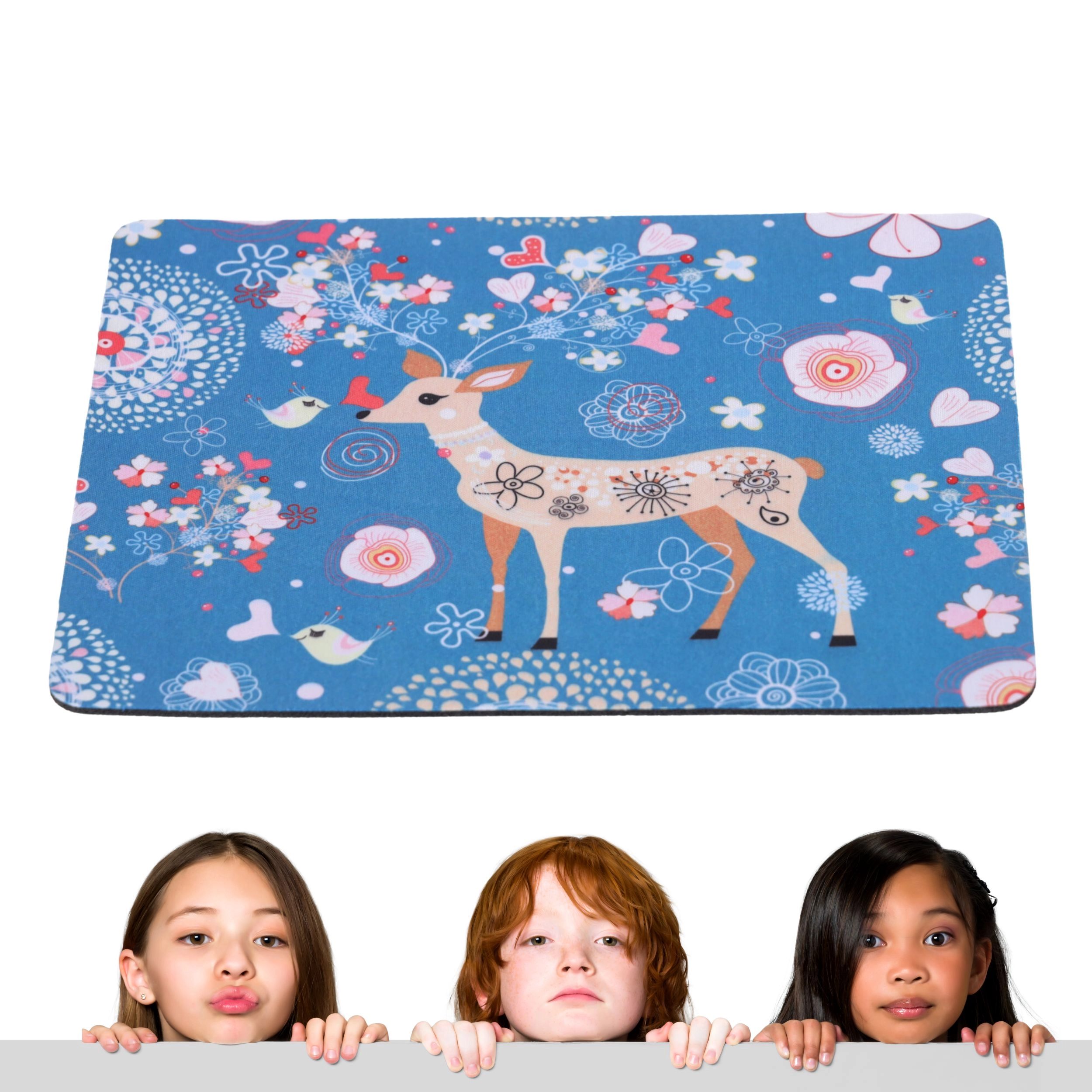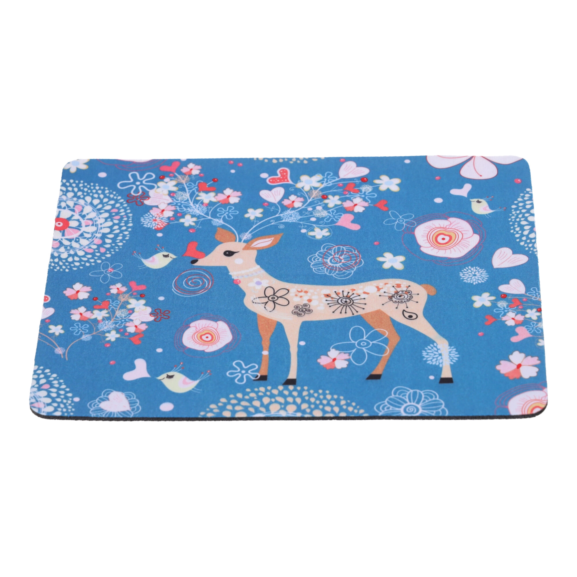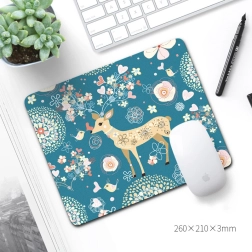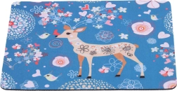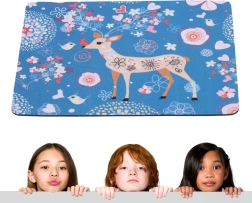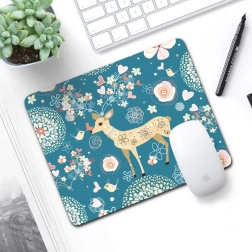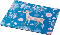 Acest mouse pad decorativ, cu fundal albastru deschis și un motiv jucăuș cu căprioară, păsărele și flori, înfrumusețează orice birou. Suprafața textilă asigură mișcarea lină a mouse-ului și o precizie ridicată a cursorului, în timp ce stratul inferior din cauciuc menține padul ferm pe poziție.