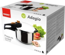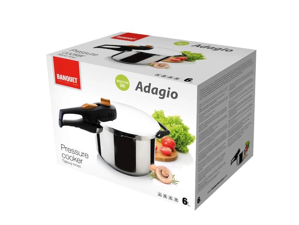 Gătire mai rapidă, rezultate mai suculente și economisire de energie – oala sub presiune BANQUET ADAGIO 6 l din oțel inoxidabil de calitate oferă două presiuni de lucru (0,6/0,9 bar), închidere bajonetă sigură, bază multistrat de 5 mm pentru încălzire uniformă și este potrivită pentru toate tipurile de plite, inclusiv inducție.