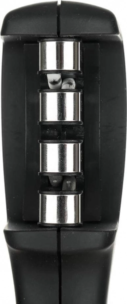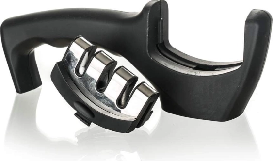 Este fabricat din plastic ABS cu finisaj soft touch și bază antiderapantă pentru o manipulare ușoară și sigură. Ascuțitoarea este potrivită atât pentru dreptaci, cât și pentru stângaci și are 3 pietre abrazive. Piatra diamantată servește la repararea lamelor deteriorate și la îndepărtarea neregularităților înainte de ascuțire. Piatra din wolfram ascute lama și îi redă forma optimă. A treia piatră este ceramică și este destinată lustruirii lamei și îndepărtării bavurilor superficiale.