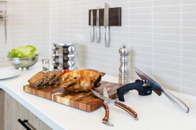 Produsul este destinat ascuțirii cuțitelor de bucătărie clasice din oțel.