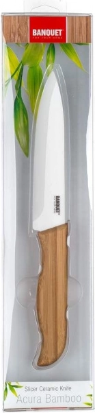 Descoperiți avantajele cuțitului ceramic Banquet Acura Bamboo, care combină eleganța și funcționalitatea. Acest cuțit este echipat cu o lamă de 13 cm realizată din oxid de zirconiu, ceea ce îi oferă duritate și rezistență ridicată. Datorită materialului ceramic, cuțitul nu influențează gustul alimentelor și vitaminele sunt păstrate în alimente. Mânerul special ergonomic din bambus cu finisaj anti-alunecare oferă confort și siguranță maximă în utilizarea zilnică.