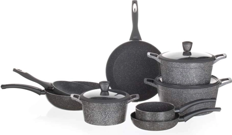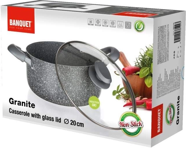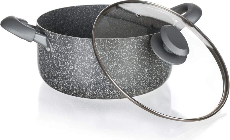 Oala BANQUET GRANITE îmbină designul modern cu funcționalitatea ridicată. Corpul din aluminiu presat asigură distribuția rapidă și uniformă a căldurii, în timp ce suprafața antiaderentă în două straturi cu efect de granit minimizează lipirea și ușurează întreținerea. Capacul din sticlă permite controlul gătitului fără pierderi inutile de căldură.