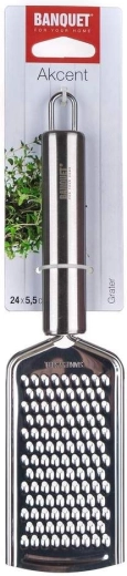 Practică și durabilă, răzătoarea din oțel inoxidabil 24 cm Akcent pentru uz profesional și casnic. Oferă întreținere ușoară, posibilitate de spălare în mașina de spălat vase și agățătoare pentru depozitare economică.
