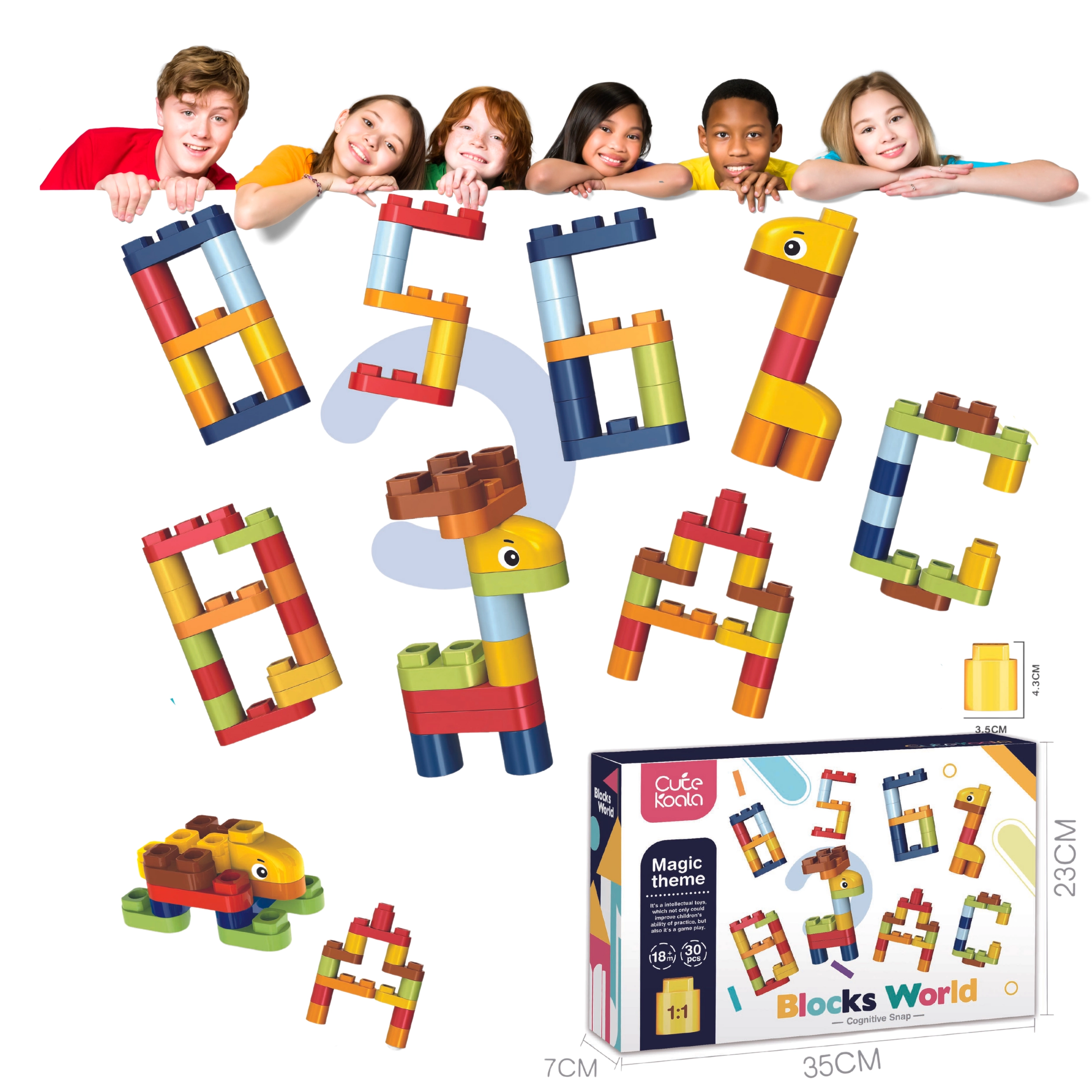 Acest set inteligent de cuburi este un ajutor excelent pentru primii pași în lumea literelor și cifrelor. Copiii învață în mod natural să potrivească forme, să recunoască simboluri și să exerseze coordonarea mână–ochi. Jocul cu cuburile întărește, de asemenea, răbdarea și gândirea logică.