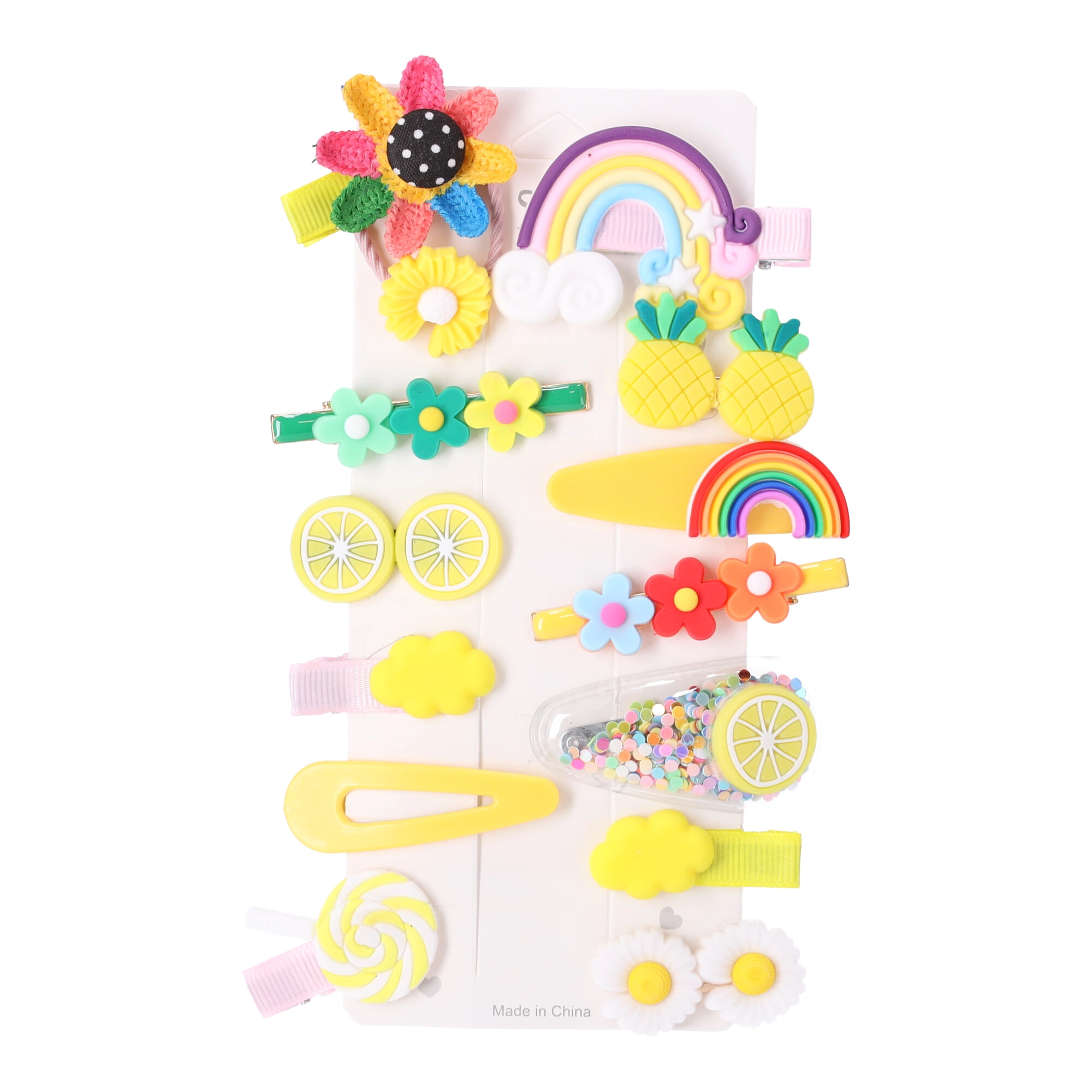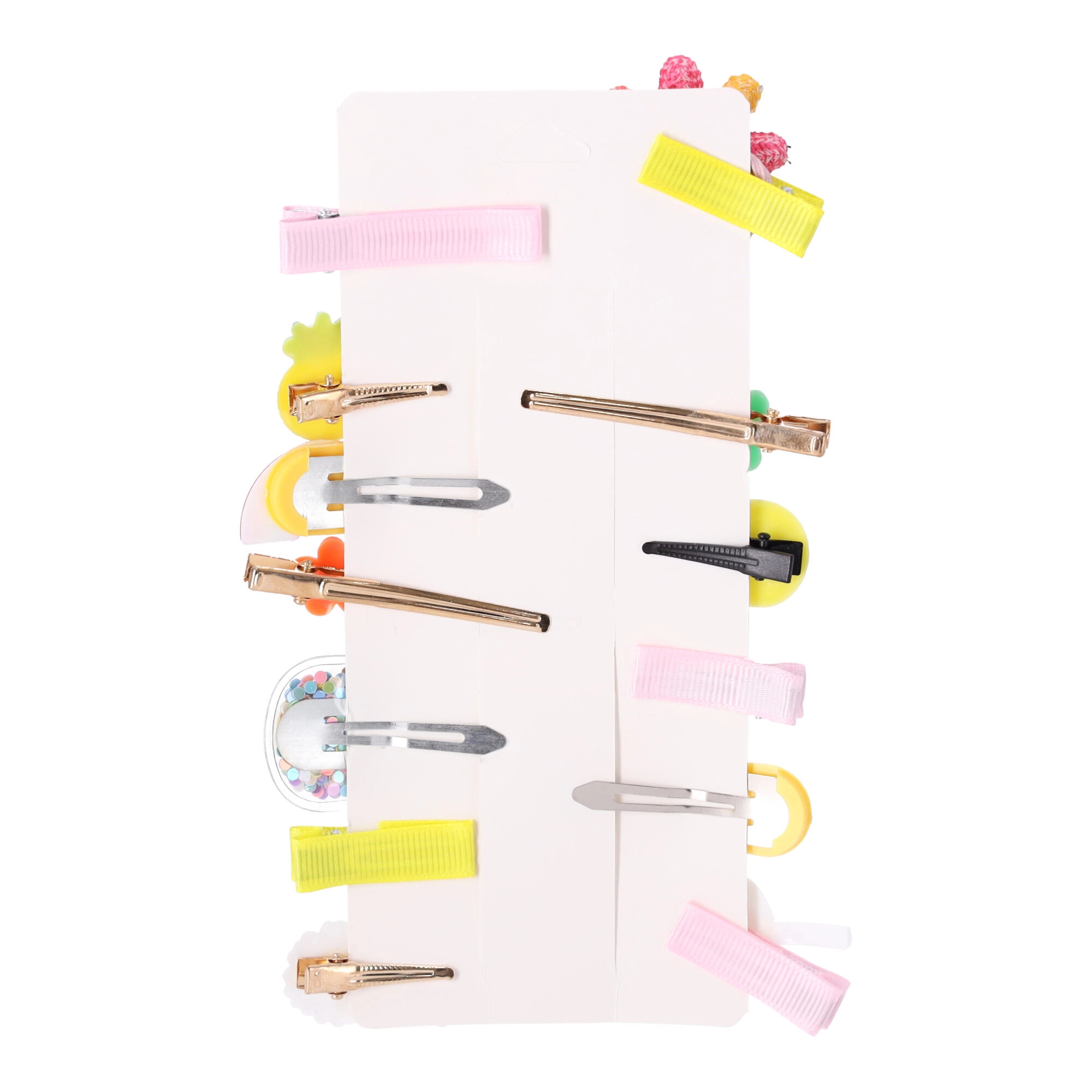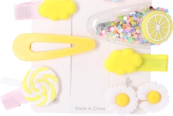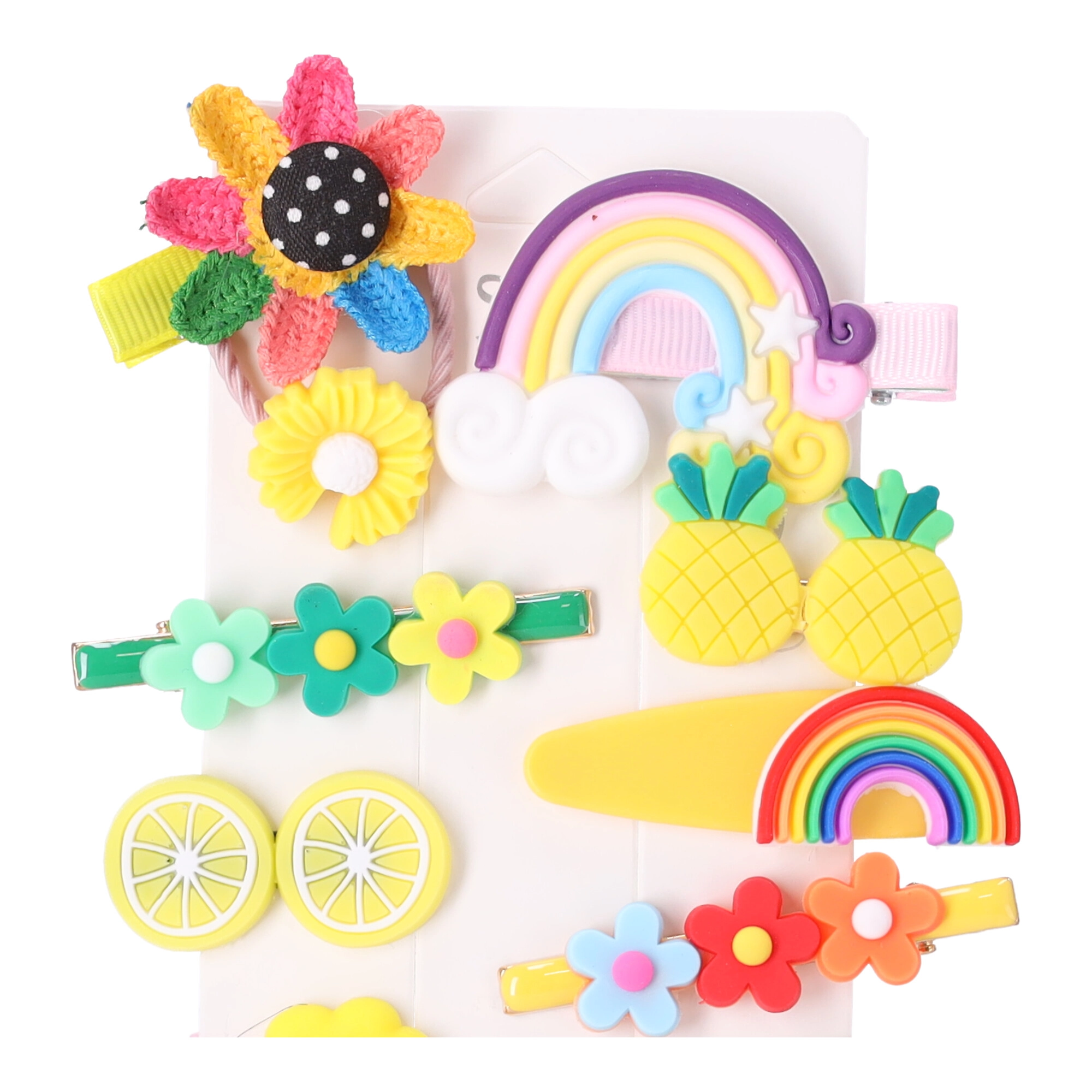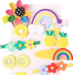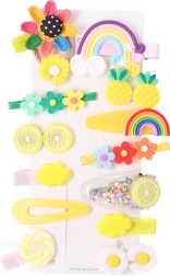Set drăguț de 14 agrafe colorate pentru păr pentru fete, ce îmbină stilul și practicitatea. Forme și motive variate – de la flori la curcubee și fructe – mențin coafura fixă și adaugă un aer jucăuș atât ținutelor de zi cu zi, cât și celor de sărbătoare. Ideal pentru grădiniță, școală și pentru nunți sau botezuri.