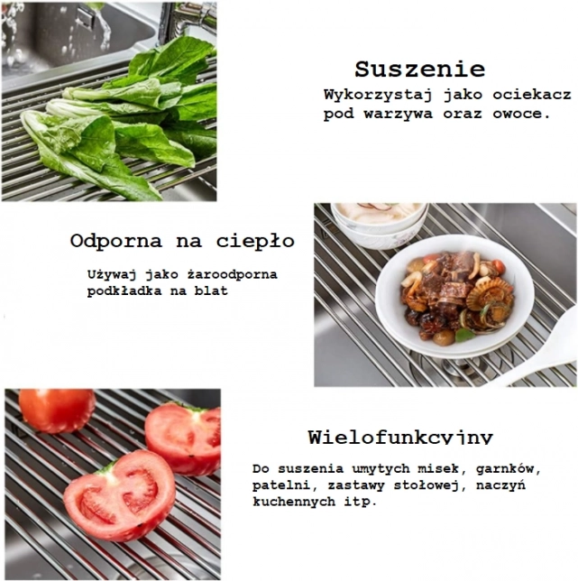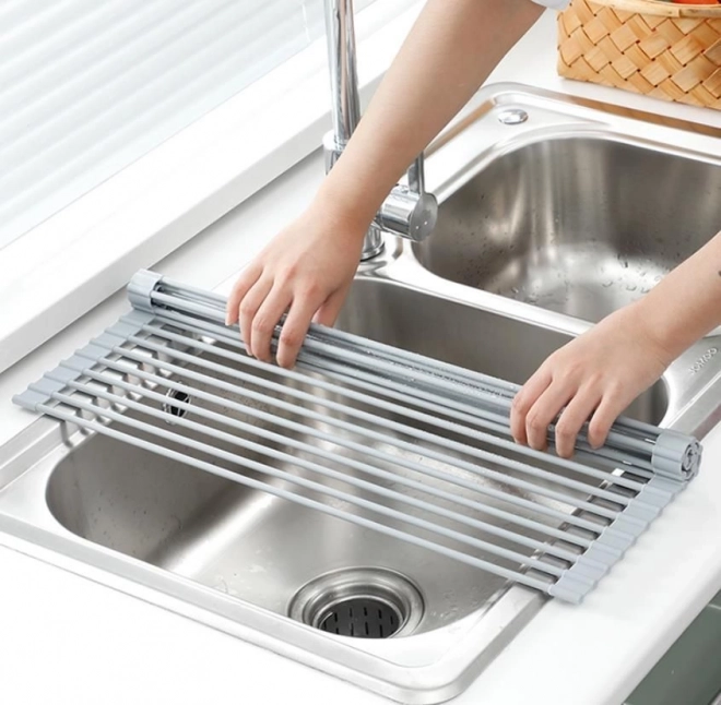 Suportul de uscare sub formă de covor rulabil este un ajutor foarte util în bucătărie. Este conceput astfel încât să se ruleze ușor și să ocupe un spațiu minim când nu este utilizat. Gratie acestuia, se pot clăti ușor fructele și legumele sau se pot usca vasele, apa scurgându-se direct în chiuvetă, iar vasele se usucă rapid. Întreținere simplă fără efort - este suficient să se clătească și să se lase să se usuce. Potrivit atât pentru bucătării moderne, cât și clasice.