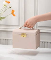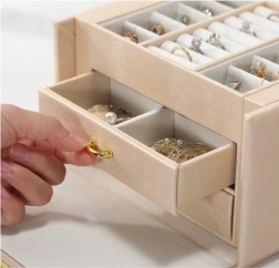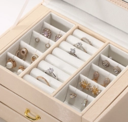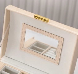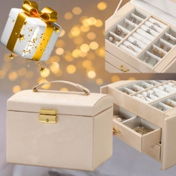 Această cutie de bijuterii pe mai multe niveluri este concepută pentru depozitarea sigură și ordonată a cerceilor, inelelor, brățărilor, lanțurilor și ceasurilor. Căptușeala interioară moale protejează bijuteriile împotriva zgârieturilor și încurcăturilor, în timp ce închiderea metalică aurie asigură blocarea fiabilă. Designul atemporal și modern se potrivește perfect în dormitor, dressing sau camera copiilor.