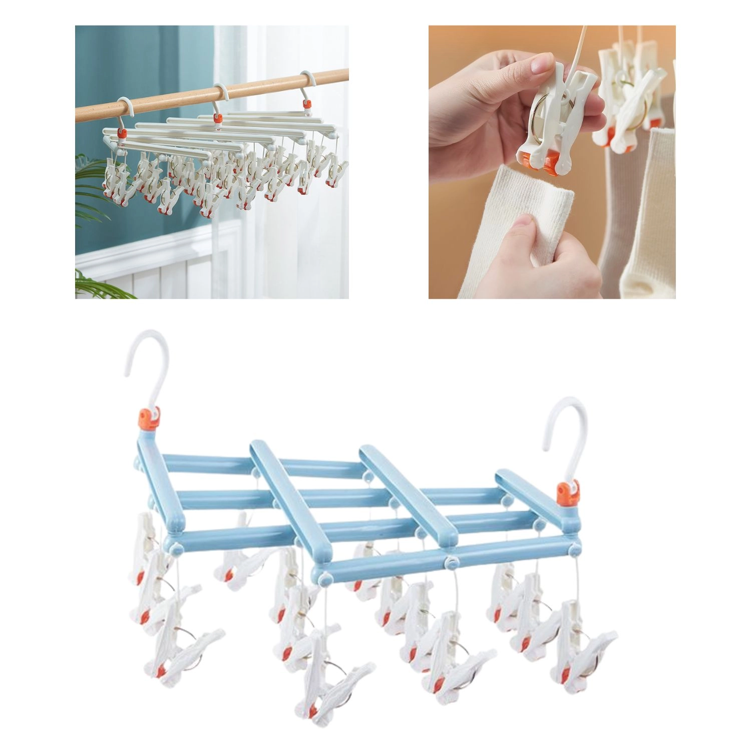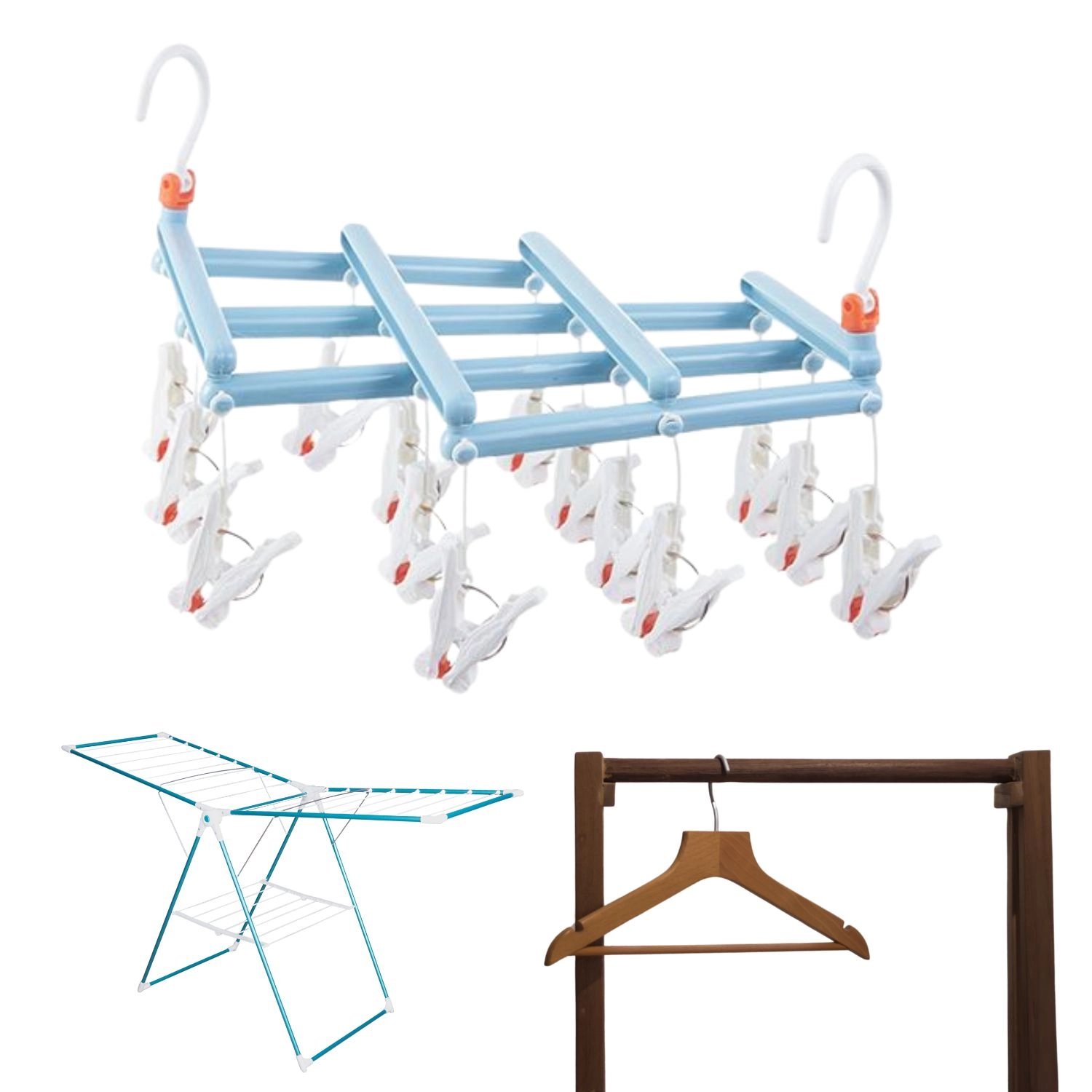 Datorită cârligului rotativ cu blocare, îl puteți agăța de o bară, sfoară, balcon sau uscător clasic. Structura pliabilă economisește spațiu la depozitare și transport – perfect pentru apartament, casă de vacanță sau camping.