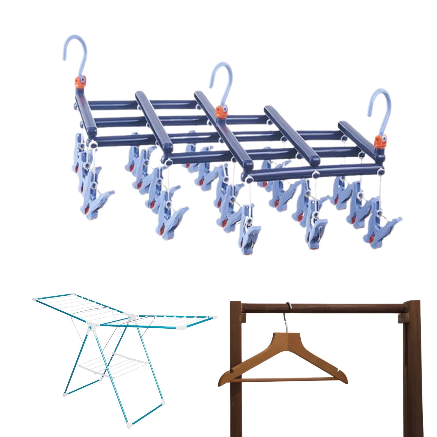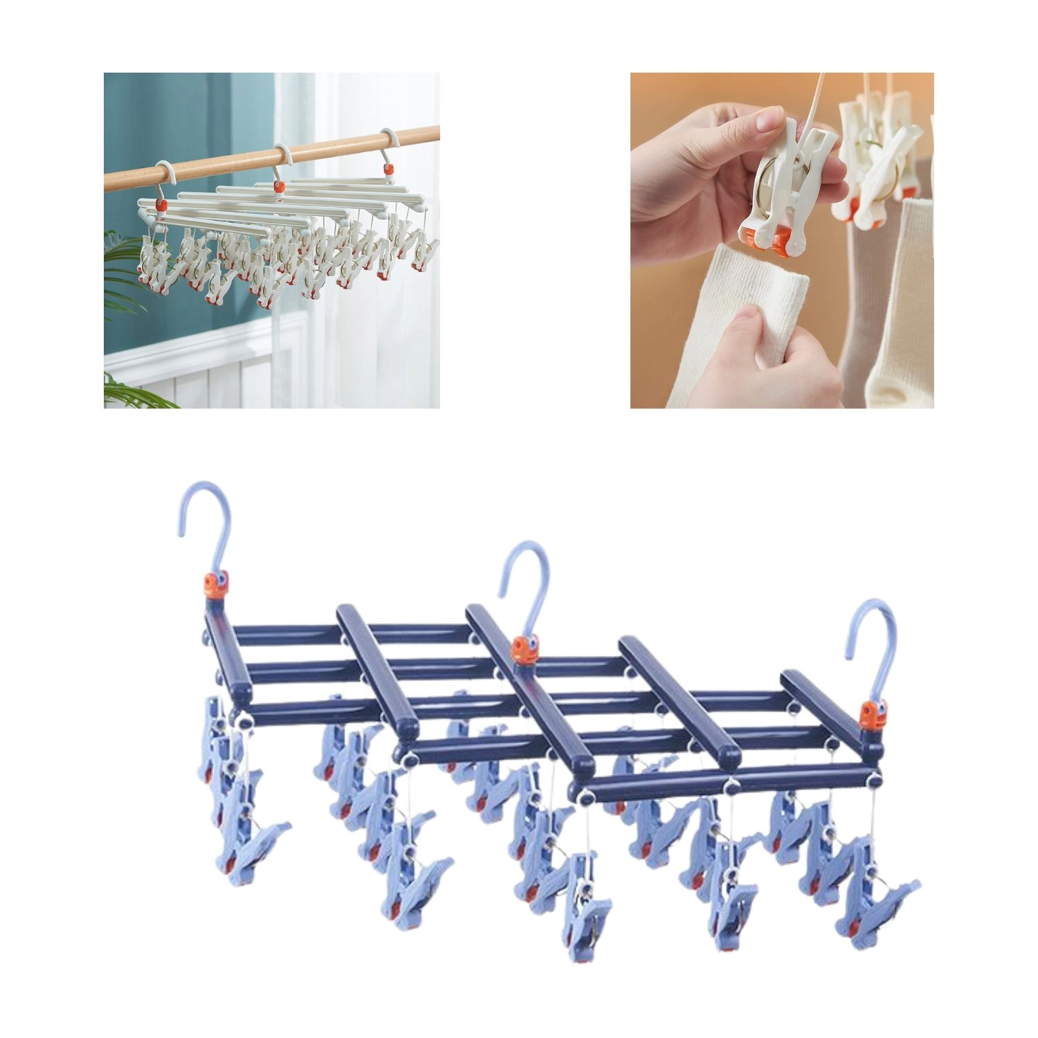 Economisiți spațiu și timp cu uscătorul pliabil cu 19 clipsuri, care poate usca simultan multe articole mici. Plasticul durabil rezistă la umezeală, clipsurile cu formă ergonomică fixează ferm și nu deteriorează țesăturile. Cârligul rotativ cu blocare permite agățarea aproape oriunde – pe bară, sfoară sau suport clasic.