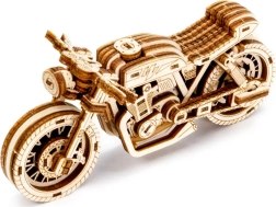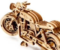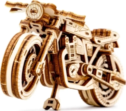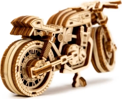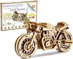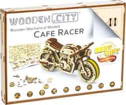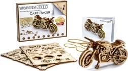 Asamblează o motocicletă Café Racer stilată din placaj natural și bucură-te de mecanica funcțională. Datorită mecanismului de recul și motorului cu bandă elastică, modelul pornește până la 1 metru, are roți cauciucate, mecanism cu volant și comenzi realiste. Asamblarea se face fără lipici și unelte, iar ambalajul servește drept suport.