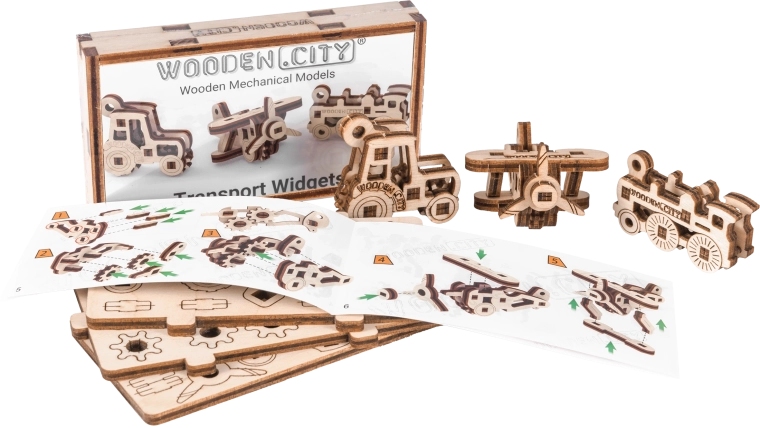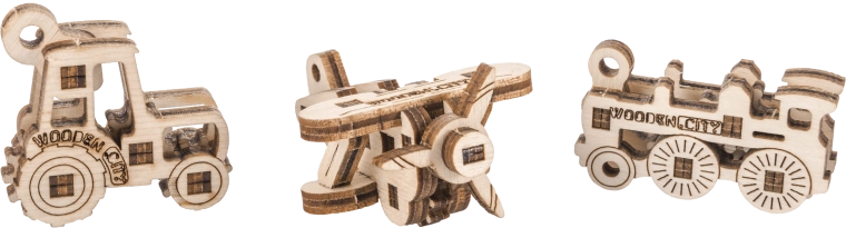 Modelul include imitații de avion, locomotivă și tractor. Aceste modele pot fi folosite ca decorațiune pentru chei sau agățate de rucsac datorită găurilor perforate. Produsele marca WOODEN CITY sunt ambalate ecologic, fără plastic.