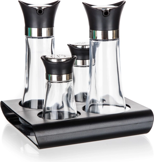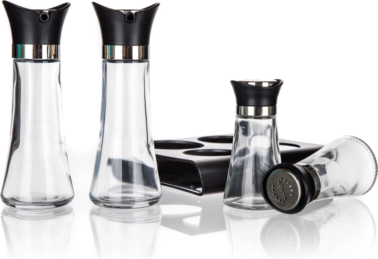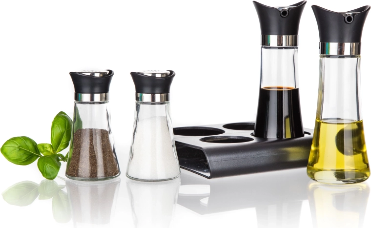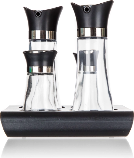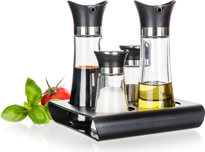 Două dozatoare pentru ulei și oțet (110 ml) și două recipiente pentru sare și piper (60 ml), într-un suport robust, mențin masa dvs. ordonată și elegantă.
