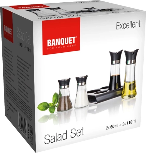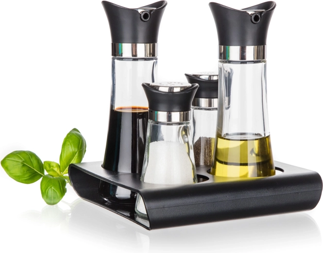 Setul de condimente BANQUET EXCELLENT este ideal pentru utilizare zilnică, acasă sau în gastronomie. Datorită celor două dozatoare pentru ulei și oțet și recipientelor separate pentru sare și piper, veți avea mereu la îndemână condimentele preferate. Suportul modern, negru, păstrează totul ordonat într-un singur loc și decorează orice bucătărie sau masă.