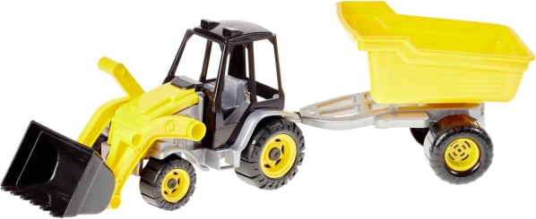 Tractor cu un încărcător larg și mobil în partea din față a jucăriei și o remorcă detașabilă în partea din spate. Remorca albastră, care poate fi basculată în spate, este montată pe un șasiu cu o singură axă. Setul are elemente mobile care vor face jocul copilului dvs. mai atractiv și îi vor influența pozitiv dezvoltarea.