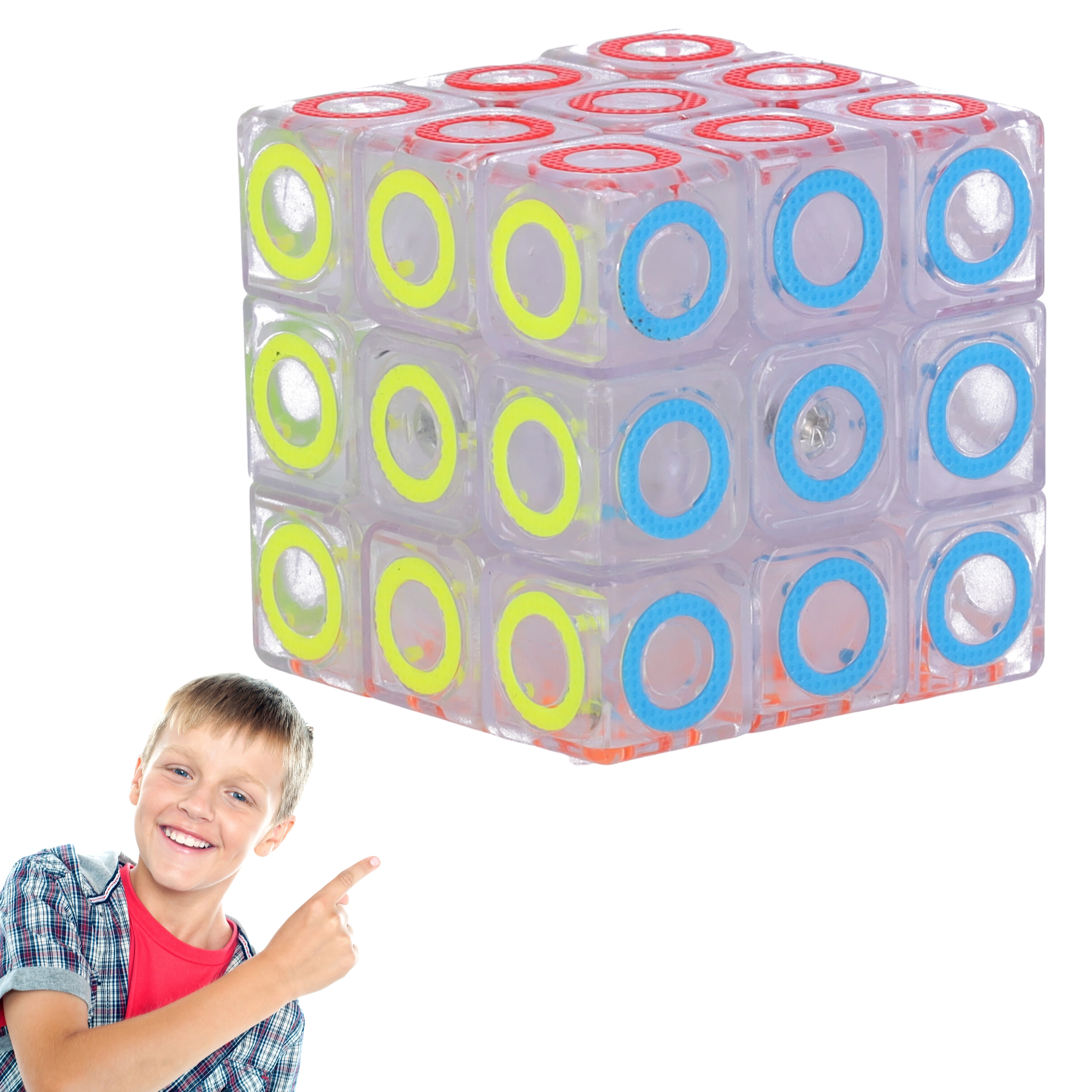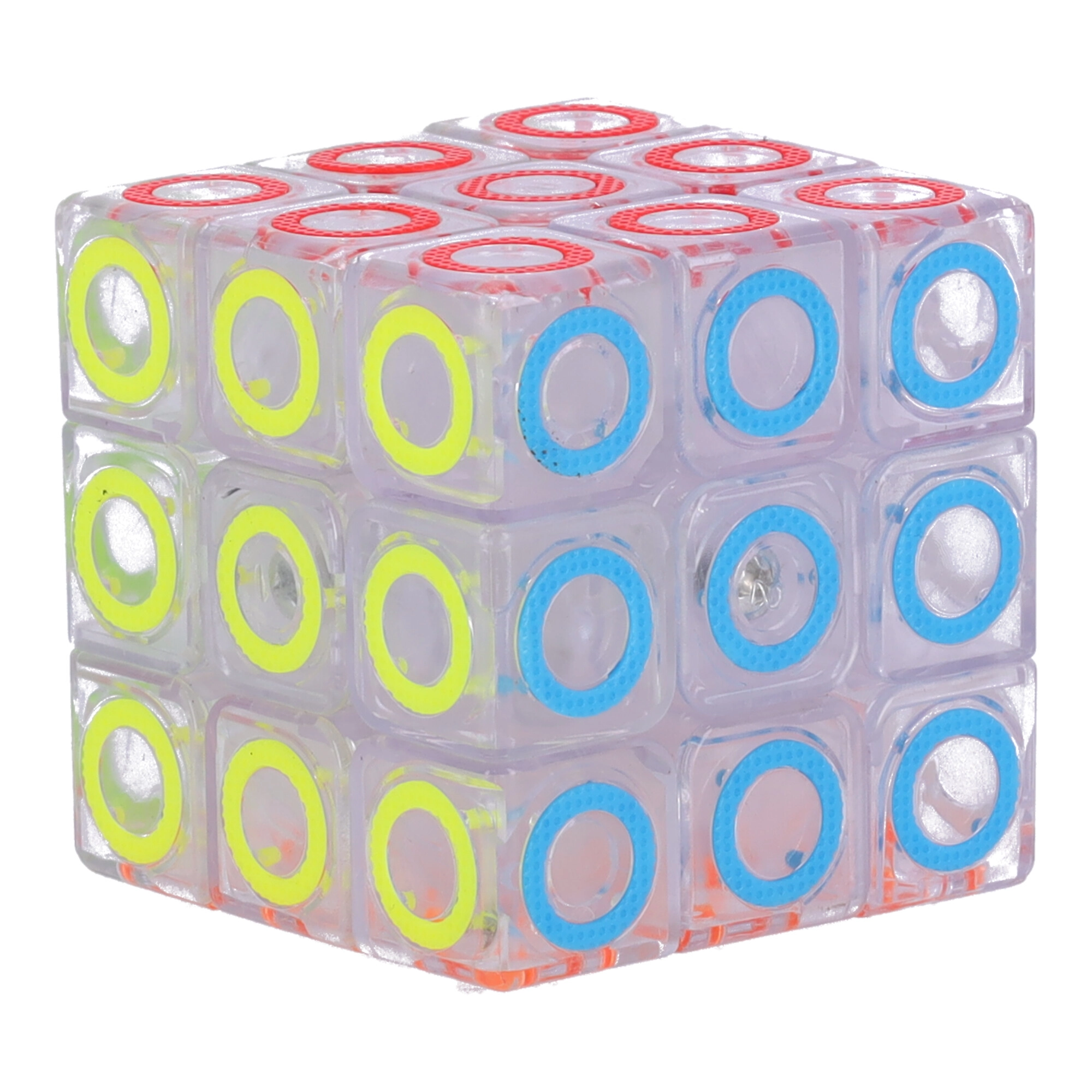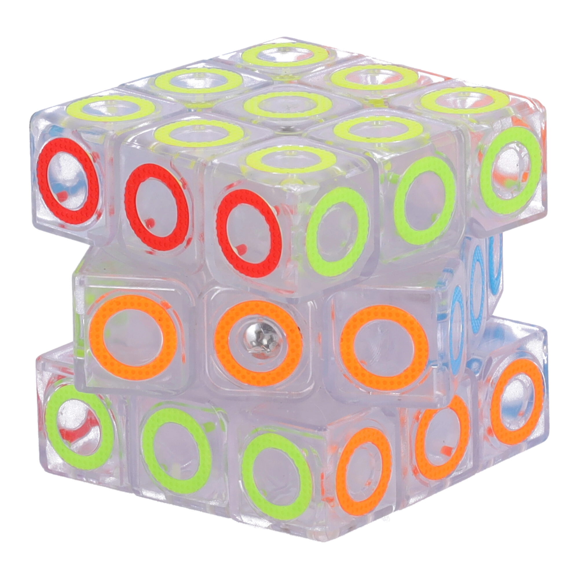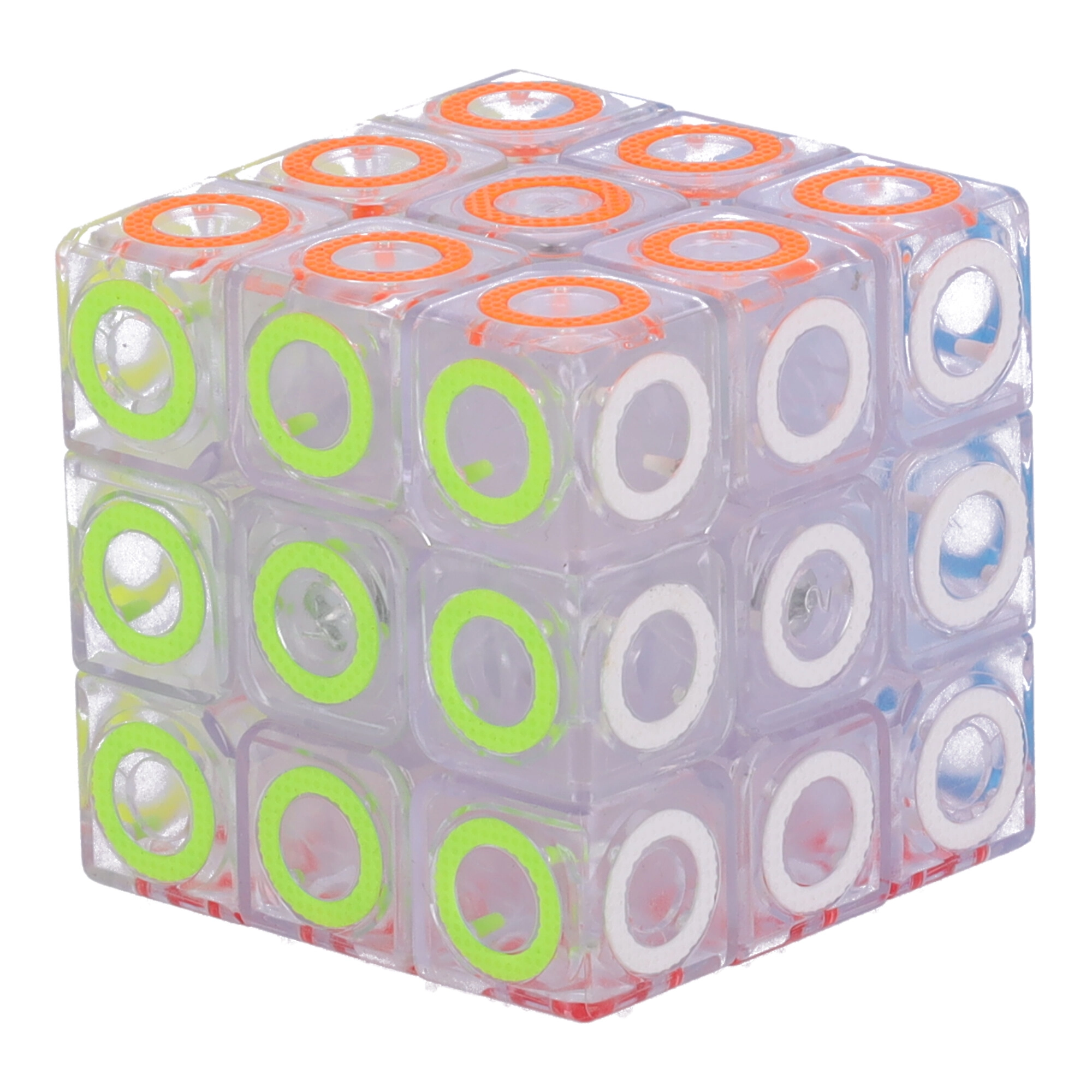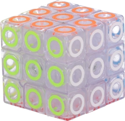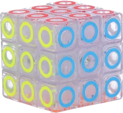 Carcasa transparentă cu inele colorate oferă cubului un aspect modern și claritate la asamblare.