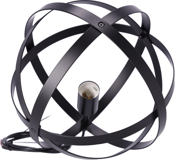 Structura sferică cu benzi metalice împletite oferă lămpii un aspect geometric și original.
