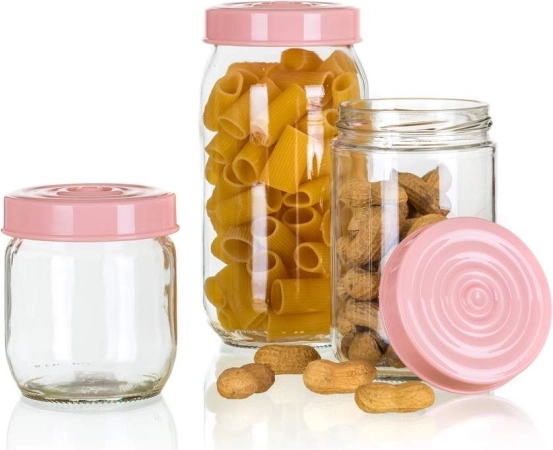 Setul de 3 borcane LINZI cu capacități de 425 ml, 660 ml și 1000 ml poate fi folosit practic pentru toate tipurile de alimente, fie că este vorba de condimente, paste sau zahăr. Borcanul din sticlă are un capac care se potrivește etanș, cu decor granit.