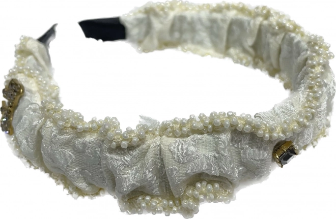 Designul original cu material textil bej și mărgele albe evidențiază eleganța vintage.