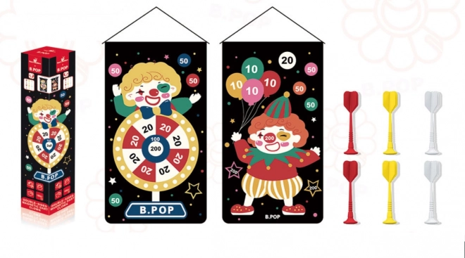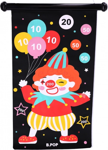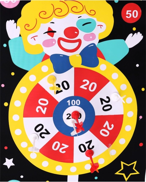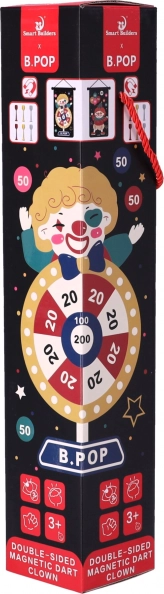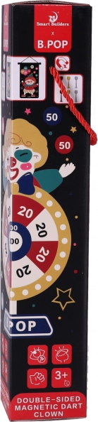 Acest joc de darts pe disc magnetic, sigur și dublu-față, presupune lovirea exactă a unor puncte specific marcate cu săgeți magnetice. Setul include 6 săgeți magnetice în trei culori: alb, galben și roșu. Ținta este realizată dintr-un material textil negru, ilustrat cu un clovn colorat. Copiii își pot exersa precizia, concentrarea și îndemânarea în timp ce se distrează. Caracteristica de a putea rula scutul facilitează depozitarea și transportul atunci când nu este folosit.