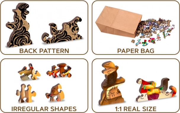 Asamblarea puzzle-ului cu piese de forme variate este mai dificilă și reprezintă o provocare mai mare decât asamblarea unui puzzle clasic. În plus, puzzle-ul este față-verso: îl puteți asambla după imagine (partea frontală) sau după formă (partea verso cu model). Marca WOODEN CITY, pe lângă conceptul unic de puzzle, nu uită de ecologie, de aceea nu veți găsi ambalaje din plastic la aceste produse. Cu piese modelate unic care reprezintă clădiri, obiecte sau animale cunoscute în funcție de tema motivului. Grad de dificultate mai ridicat cu un număr mai mic de piese – asamblarea puzzle-ului cu piese de forme variate este mai solicitantă.