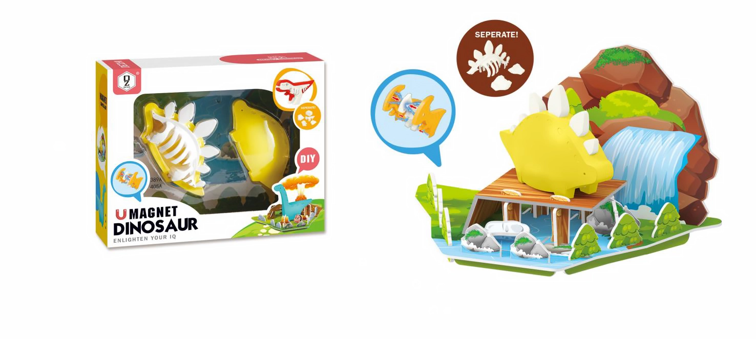 Setul de construcție cu dinozaur magnetic combină asamblarea scheletului cu crearea unei scene spațiale, oferind copiilor o experiență de joc completă. Asamblarea este ușoară datorită conectorilor magnetici, care țin ferm și permit în același timp reconfigurări rapide.