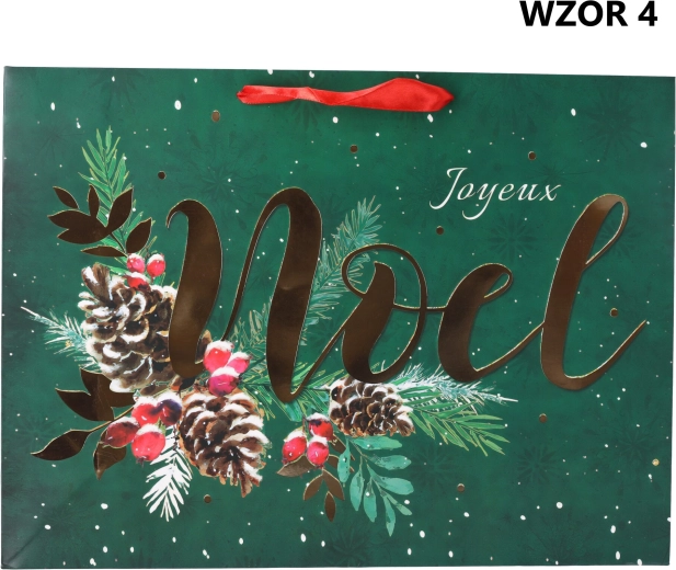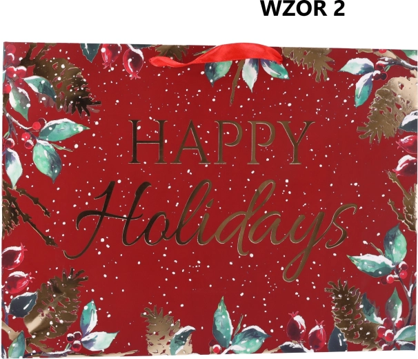 Mostre și design: Punga este decorată cu diverse modele și motive de sărbătoare. Acestea pot include imagini precum fulgi de zăpadă, ornamente pentru bradul de Crăciun, reni, Moș Crăciun sau alte motive asociate Crăciunului. Inscripția „Happy Holidays” adaugă o notă caldă și veselă.