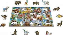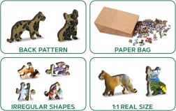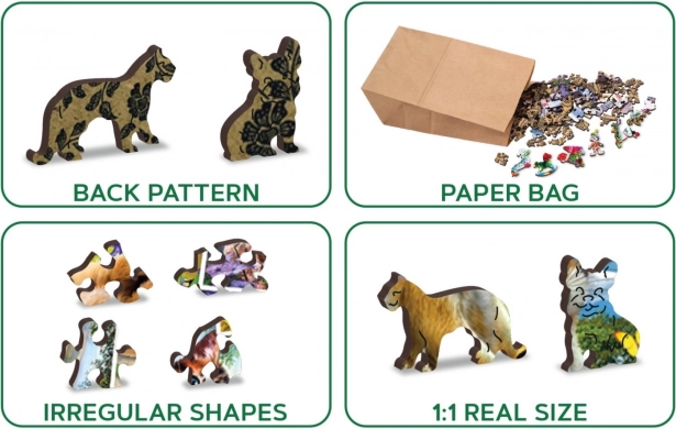 Puzzle-ul din lemn WOODEN CITY cu motivul „Cărți poștale cu animale” oferă o experiență unică de asamblare. Datorită execuției pe ambele fețe, poți alege între asamblarea după imaginea de pe față sau după formele de pe verso, cu un model repetitiv. Detaliile evidențiate cu laser conferă pieselor un aspect impresionant, iar unele dintre ele – în formă de animale, clădiri sau obiecte – pot sta singure ca mici figurine.
