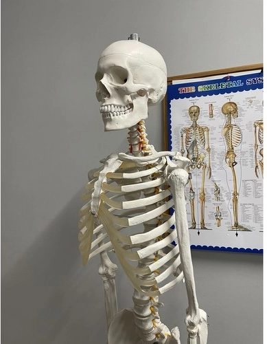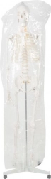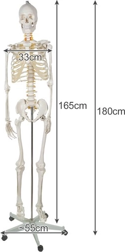 Modelul scheletului măsoară 165 cm singur și 180 cm cu suportul atașat, reprezentând o dimensiune realistă a unui adult.