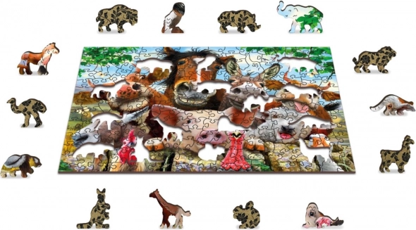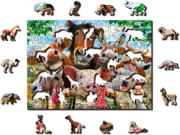 Puzzle-ul din lemn cu tema „viața la fermă” oferă o experiență unică de asamblare a unei imagini colorate pline de animale vesele. Datorită decupajului cu laser al fiecărei piese cu grosimea de 3–4 mm, asamblarea este fluidă și distractivă, iar unele piese au forma unor figurine individuale. Imprimarea pe ambele fețe permite asamblarea atât după imagine, cât și după modelul de pe verso.