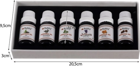 Setul conține șase arome diferite precum eucalipt, portocală, tea tree, mentă, lavandă și pin. Fiecare ulei este atent închis într-o sticluță cu capacitatea de 10 ml.