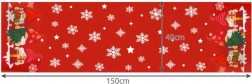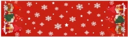 Fundal roșu cu fulgi și stele albe, iar la capete decor cu spiriduși și cadouri – accesoriul perfect pentru masa de Crăciun.