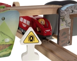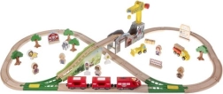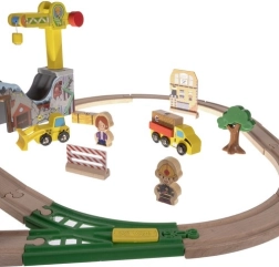 Această pistă de tren din lemn, bogat accesorizată, oferă copiilor ore întregi de joc creativ. Piesele sunt fin șlefuite și vopsite cu culori sigure. Garniturile de tren se cuplează cu magneți puternici, astfel încât rămân unite chiar și când sunt ridicate. Setul este completat de macara, poduri, indicatoare rutiere, copaci, clădiri și vehicule de lucru – totul pregătit pentru scene variate.