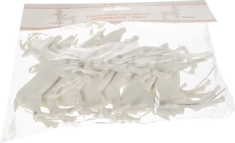 Adaugă farmecul strălucitor copacului tău de Crăciun cu aceste decorațiuni sub formă de reni. Setul conține 9 reni elegant prelucrați, fiecare acoperit cu o suprafață sclipitoare.