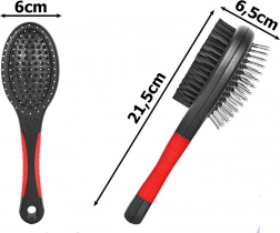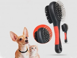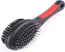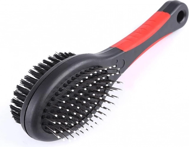 Peria dublă este un instrument universal pentru întreținerea regulată a blănii animalului tău de companie. Pinii metalici cu capete rotunjite descurcă delicat nodurile și ajută în perioada de năpârlire, iar perii de nailon deasă îndepărtează praful, netezesc și oferă blănii un luciu sănătos. Potrivită pentru blană scurtă, lungă, ondulată și aspră.