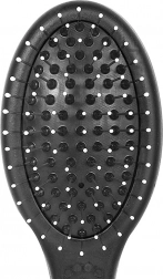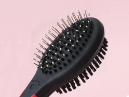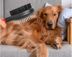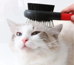 Pinii metalici cu capete rotunjite descurcă delicat zonele încâlcite, în timp ce perii de nailon deasă netezesc blana și îi oferă un luciu natural.