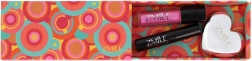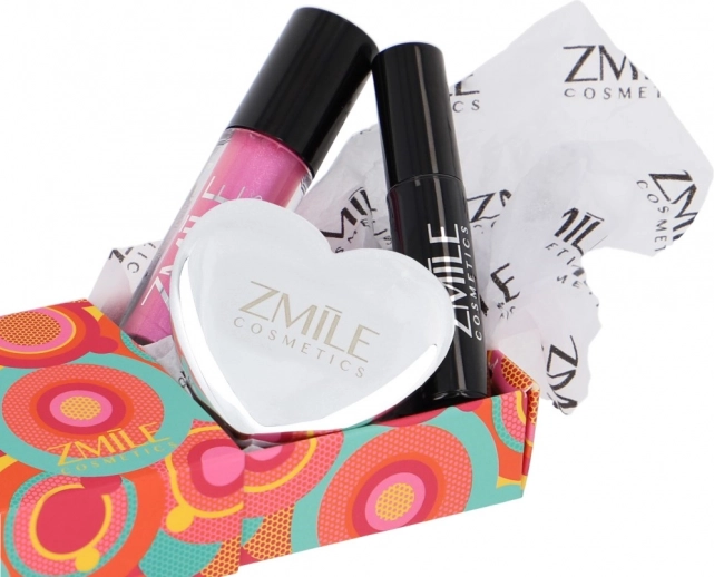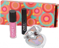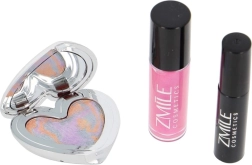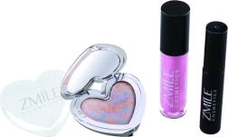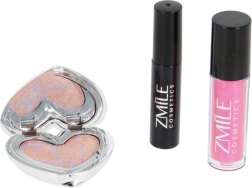 Trio-ul de produse – fardurile de ochi în paletă în formă de inimă, glossul de buze și mascara – formează un set practic pentru machiajul de zi cu zi și de seară.