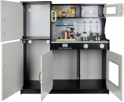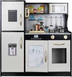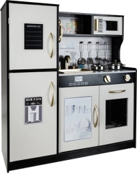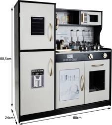Bucătăria elegantă din lemn XL de la KRUZZEL, în combinație de negru, alb și auriu, le oferă copiilor un joc realist de gătit. Oferă iluminare LED, efecte sonore ale arzătoarelor, elemente interactive și accesorii bogate incluse (oală, tigaie, capac, 4 linguri). Chiuveta detașabilă, cuptorul, cuptorul cu microunde și dulapurile cu închidere „click” susțin creativitatea, învățarea prin joc și jocul de rol.