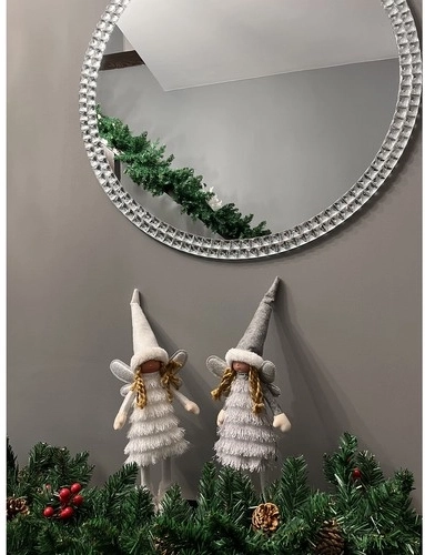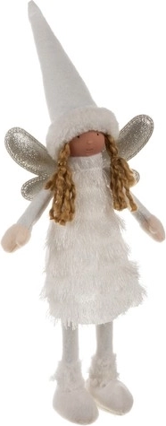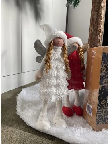 Elegantă figurină de Crăciun, înger/elf, în alb imaculat, aduce în interior farmecul sărbătorilor. Are aripioare sclipitoare, încălțăminte stabilă cu talpă solidă și ținută de iarnă cu rochie tip helancă și căciuliță cu blăniță. Se potrivește perfect pe comodă, pervaz, lângă șemineu sau sub brad și completează minunat decorul festiv în stil modern sau clasic.
