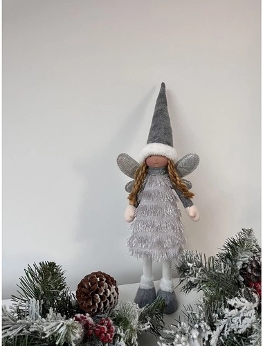 Această figurină elegantă de Crăciun, zână/înger în combinație de gri, alb și argintiu, aduce în casă o atmosferă de iarnă primitoare. Aripile sclipitoare și textilele catifelate creează un efect de magie și bucurie, specific sărbătorilor.