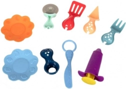 În pachet găsești 5 borcănașe de plastilină în culori diferite, care pot fi amestecate între ele pentru a crea nuanțe noi. Setul bogat de instrumente (cuțit, furculiță, lingură, farfurioare, pahare și diverse duze) susține jocul creativ, dezvoltarea abilităților și distractivul joc de-a bucătarul.