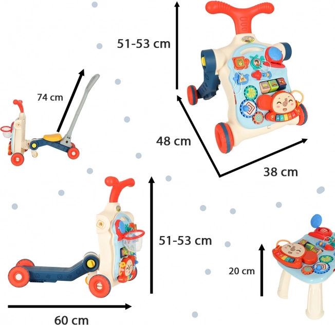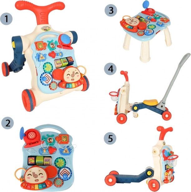 Mersul multifuncțional pentru copii și masa interactivă 5în1 oferă cinci modificări diferite în funcție de vârsta copilului: mers, trotinetă, bicicletă alergătoare, masă interactivă și tablă suspendată. Acest produs se dezvoltă împreună cu copilul dumneavoastră, fără a trebui să cumpărați jucării noi.