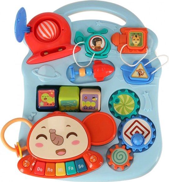Produsul este realizat din plastic rezistent și include diverse elemente interactive, precum un pian, rotițe dințate din plastic, blocuri și un coș de bile, care susțin dezvoltarea abilităților cognitive ale copilului.