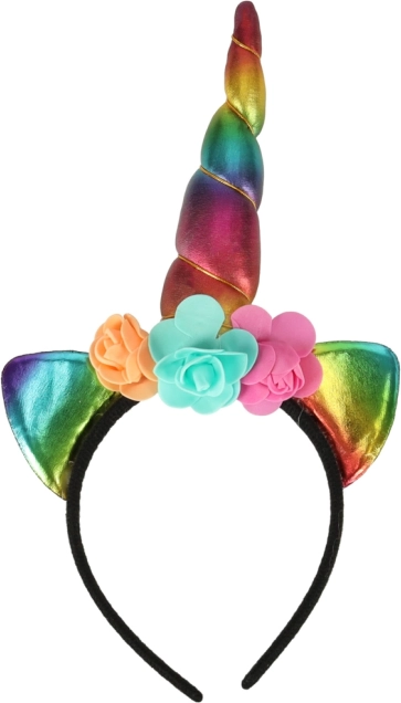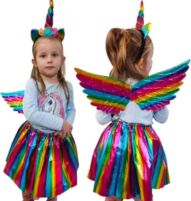 Pachetul include tot ce aveți nevoie - aripi curcubeu, bentiță cu corn și fustă, ideal pentru orice sărbătoare.