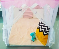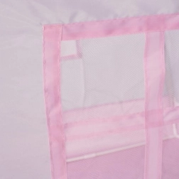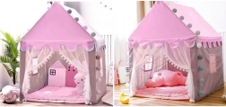 Dimensiunea 130 × 100 × 120 cm oferă spațiu suficient pentru cărți, perne și jucăriile preferate. Două ferestre din plasă și draperiile de la intrare asigură intimitate și o bună aerisire.