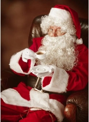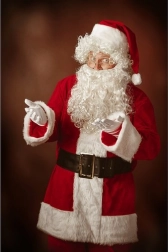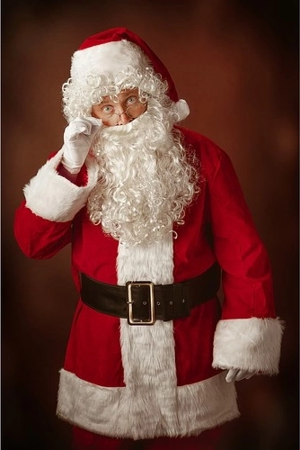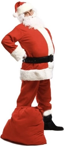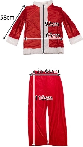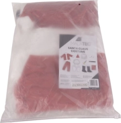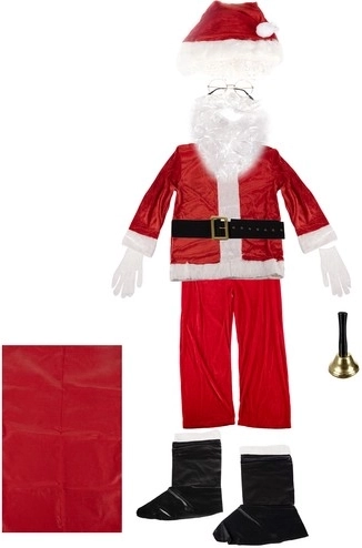 - pantaloni, jachetă, acoperitori pentru încălțăminte (2 buc.), curea, căciulă, perucă, barbă cu mustață, mănuși (2 buc.), ochelari, sac pentru cadouri, clopoțel