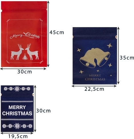 Set elegant de săculeți de Crăciun pentru cadouri, din material nețesut rezistent, în culorile roșu, verde și albastru închis. Împachetezi ușor cadourile fără foarfecă și bandă adezivă, fiecare săculeț are motiv festiv și inscripția „Merry Christmas”. Trei dimensiuni practice pentru mărunțișuri și seturi mai mari, utilizare repetată și design stilat pentru un Crăciun frumos, fără deșeuri inutile.