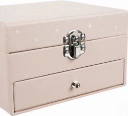 Interiorul oferă o organizare inteligentă: compartimente pentru inele și cercei, o cutiuță separată și un sertar culisant pentru alte mărunțișuri. Exteriorul este decorat cu steluțe fine și cu un unicorn, în timp ce clapeta metalică menține conținutul în siguranță.