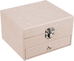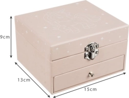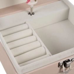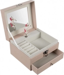 Această cutie de bijuterii drăgălașă, în tonuri delicate roz-bej, este locul ideal pentru primele bijuterii și mici comori. La deschiderea capacului se aude o melodie plăcută, iar unicornul începe să se rotească în fața oglinzii practice, care ușurează probarea cerceilor sau colierelor.